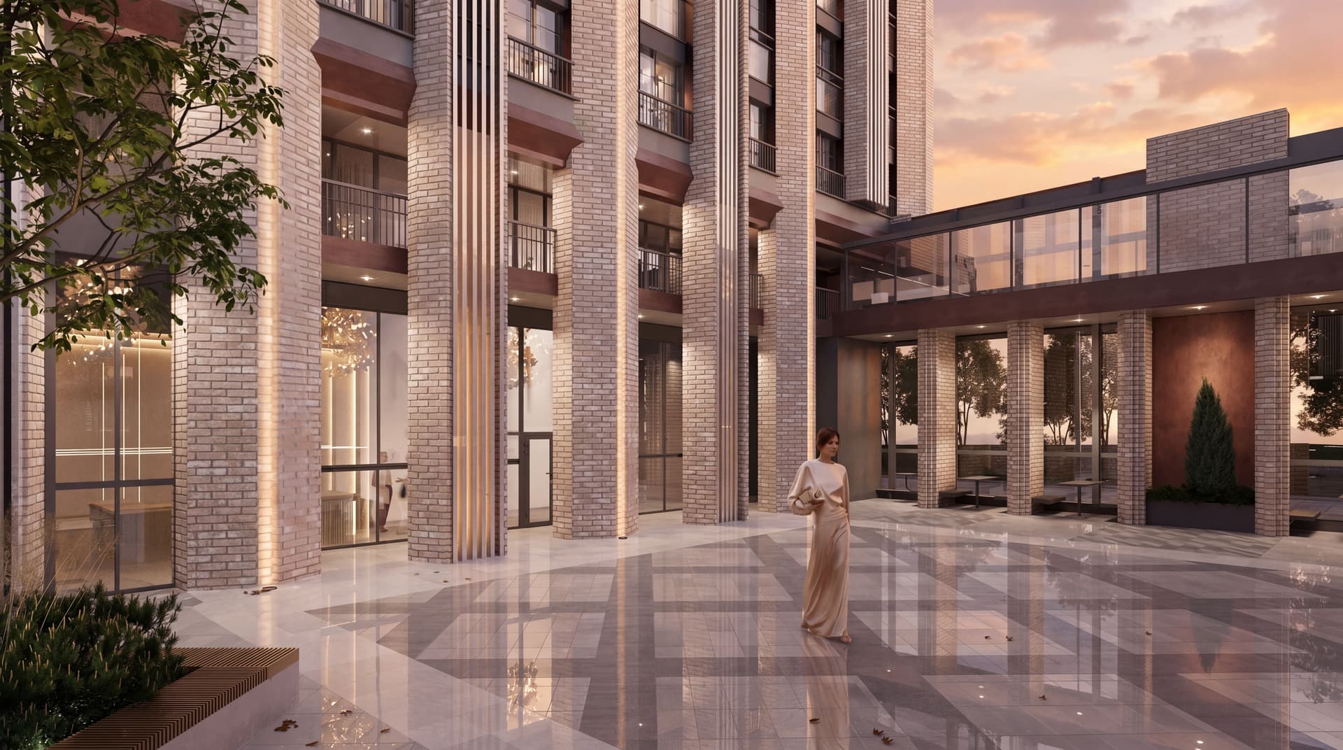 Двор, расположенный на стилобате, становится приватным пространством над городом, где сохраняется тишина, безопасность и ощущение уединения.