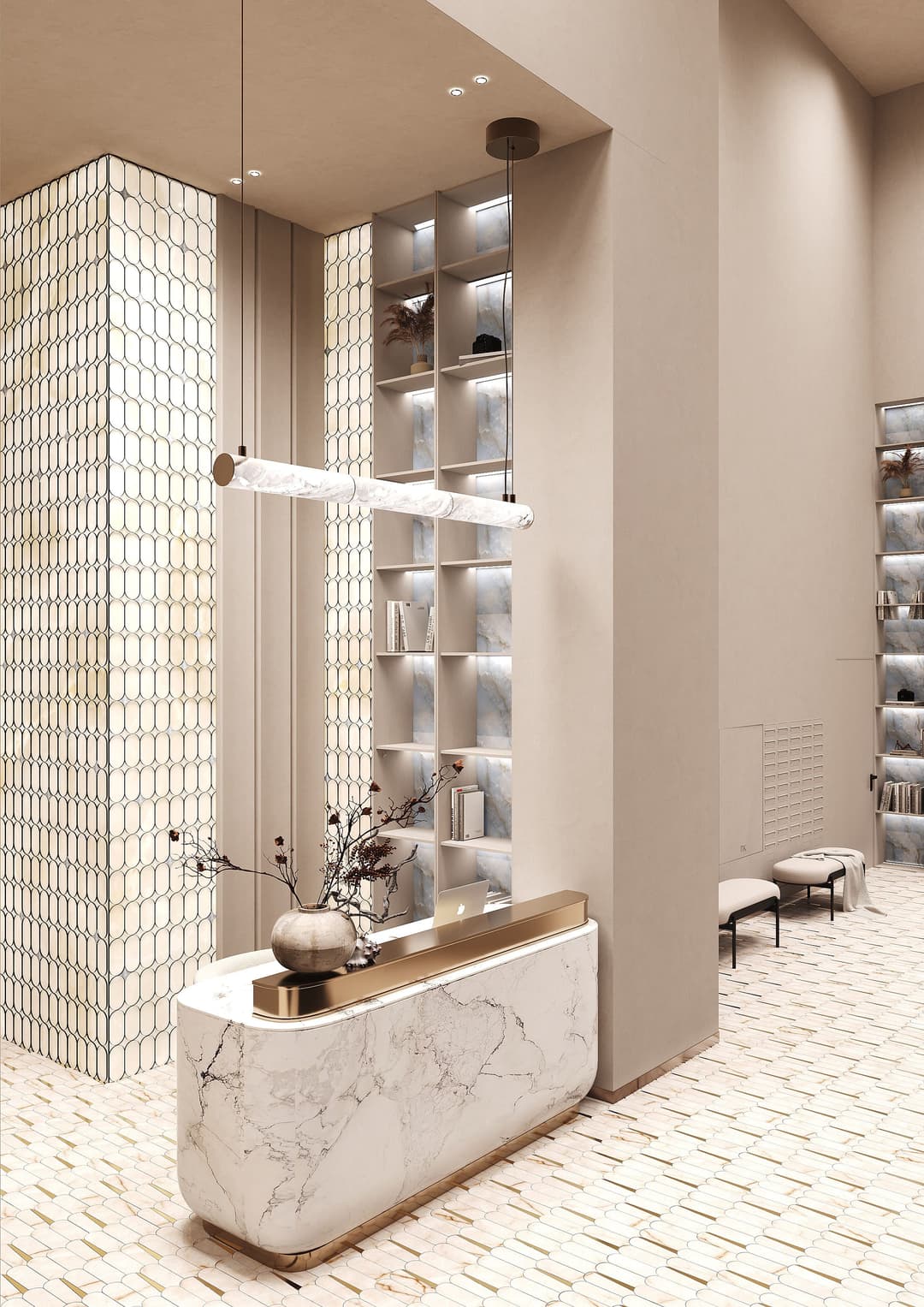 Эстетика воды в деталях архитектуры. Рифлёное матовое стекло с абстрактным рельефом, напоминающим вертикальные струи или капли воды, мягко рассеивает свет. Это решение не только создает игру бликов, но и обеспечивает безупречную приватность жителей.